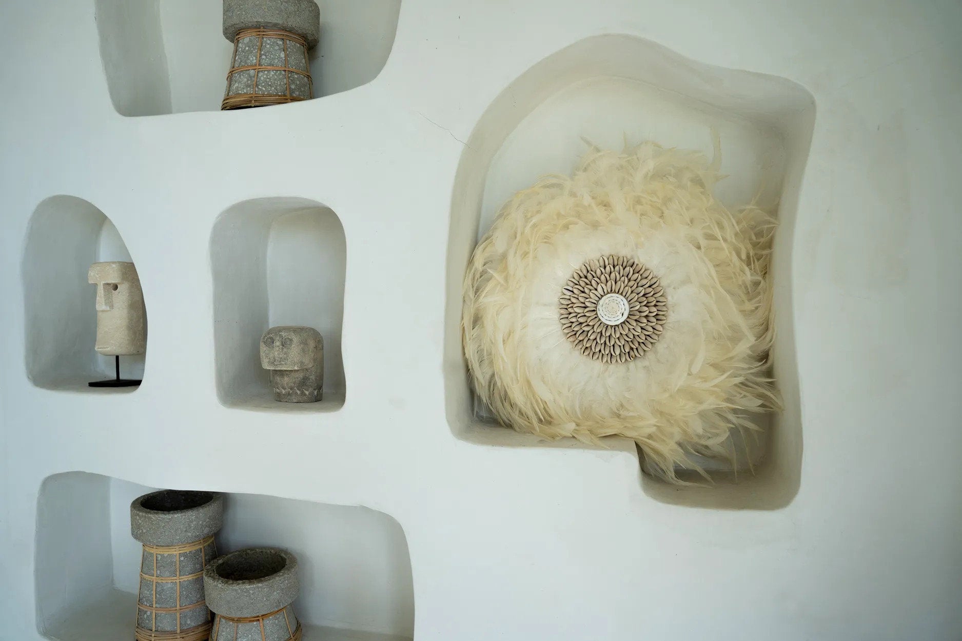 Onze prachtige feather wanddisplay is een echte bohemien schoonheid om elke muur in uw interieur, overdekt terras of tuin te versieren. De middelste cirkel is omgeven door met de hand geplaatste schelpen.